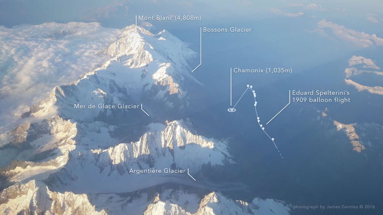 Like a one-man Google Earth, Swiss aviation pioneer Eduard Spelterini flew a gas-filled balloon from the French town of Chamonix to Switzerland on August 8, 1909 – a distance of 100 miles over the Alps. While the flight was extraordinary for being the first aerial crossing of the central Alps from west to east, it now holds a special significance of which Spelterini was unaware. The balloonist was also a photographer who captured a series of glass-plate images of the Mer de Glace (“sea of ice”) glacier that descends from the Mont Blanc Massif in a dramatic sweep.
